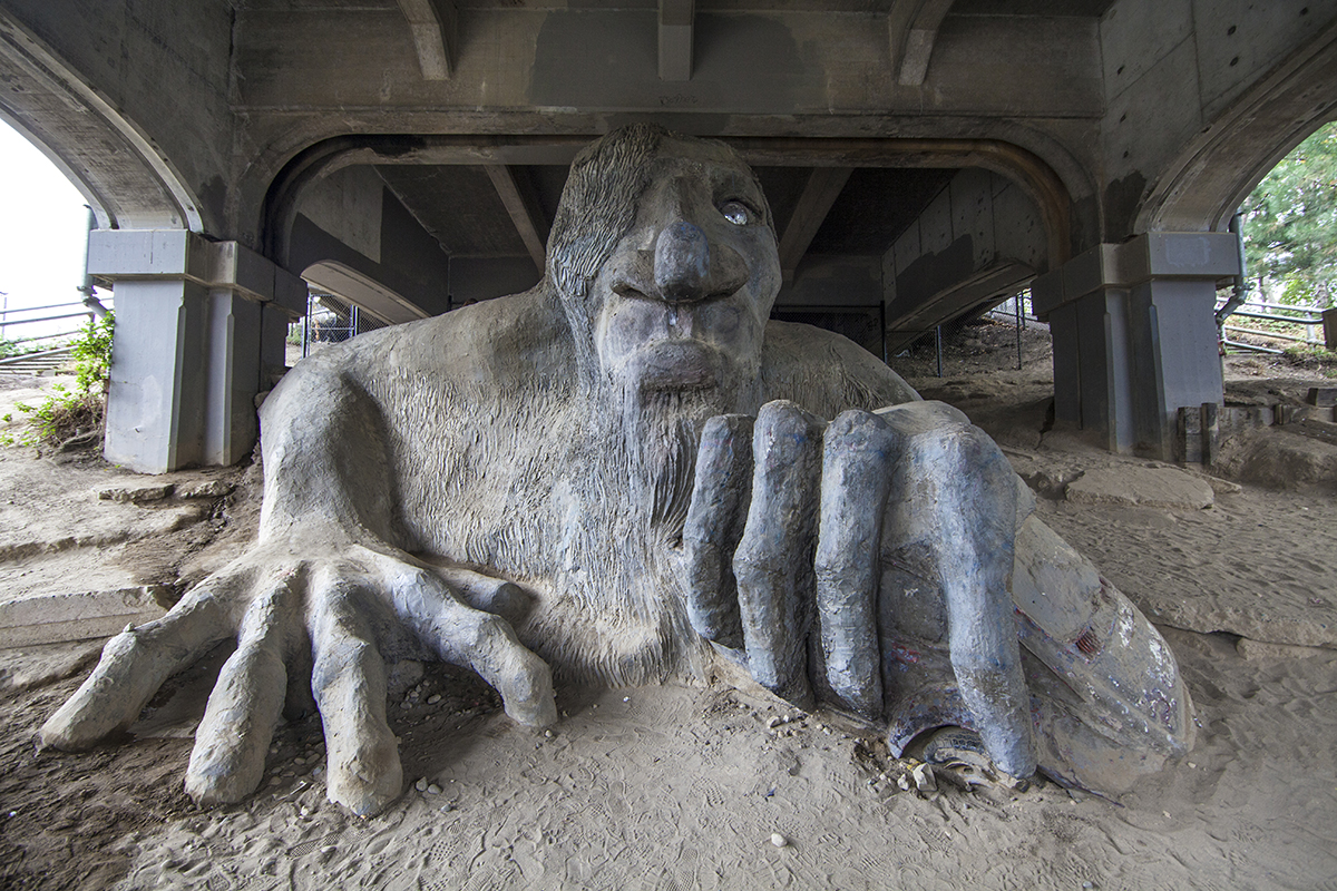 Escape the rain under a bridge with the Fremont Troll! No need to worry about raindrops on the lens at this classic photo spot.