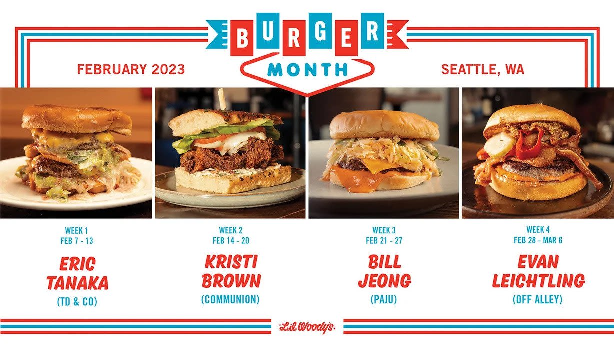 Woody’s kicks off its popular Burger Month {#SeattleBurgerMonth} on Tuesday, February 7, 2023. All Li’l Woody’s locations will be featuring a weekly burger from 4
