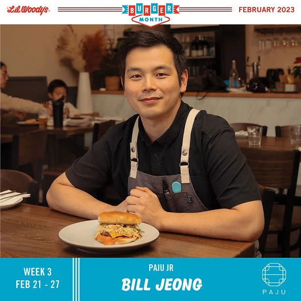 Says Bill: “During the 2020 pandemic, we pivoted from in-restaurant dining to creating a Japanese sandwich pop-up for takeout. We needed to come up with food that could withstand traveling. We created many sandwich recipes, but the one that included kimchi coleslaw on our pork loin sandwich was a favorite. Our Paju Jr. burger for Lil Woody’s Burger Month is a play on that sandwich. The kimchi coleslaw counterbalances the richness and gives it texture. It is even more delicious with the umami built into it.”
